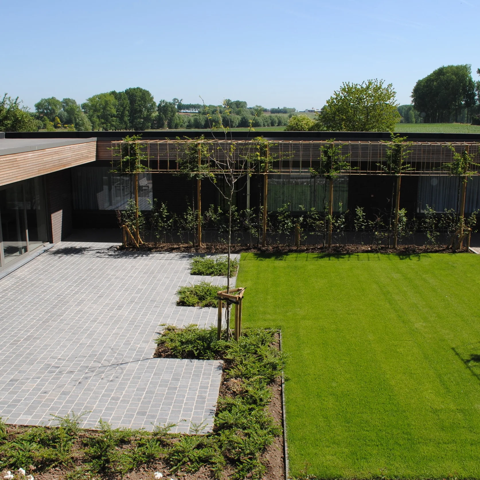 Ook het terras en tuin op de binnenplaats en de boomgaard achteraan zorgen voor een aangename woonomgeving voor de bewoners.